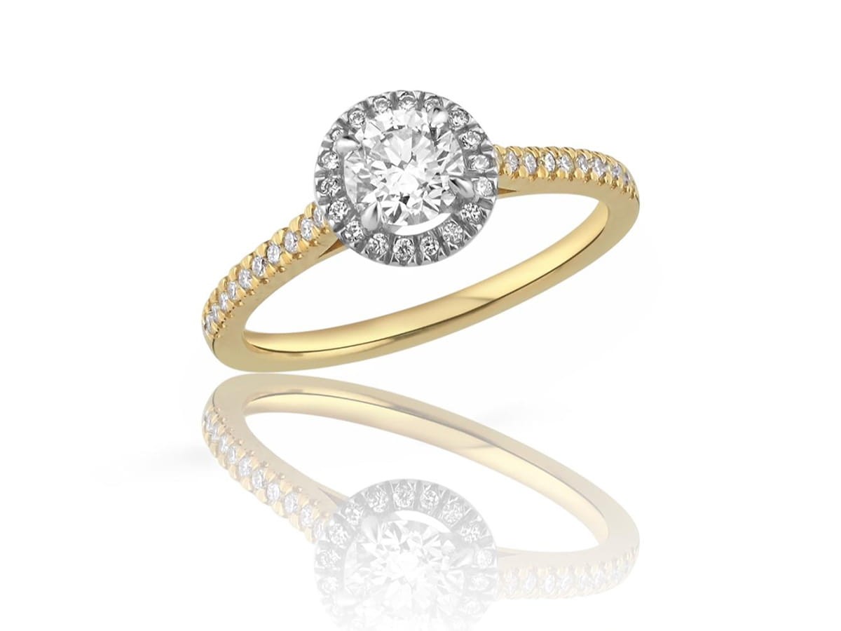 Luksusowy pierścionek z diamentem laboratoryjnym 1,05 ct otoczonym halo z drobniejszych kamieni. Model wykonany ze złota 14K, o klasycznej i niezwykle eleganckiej formie.